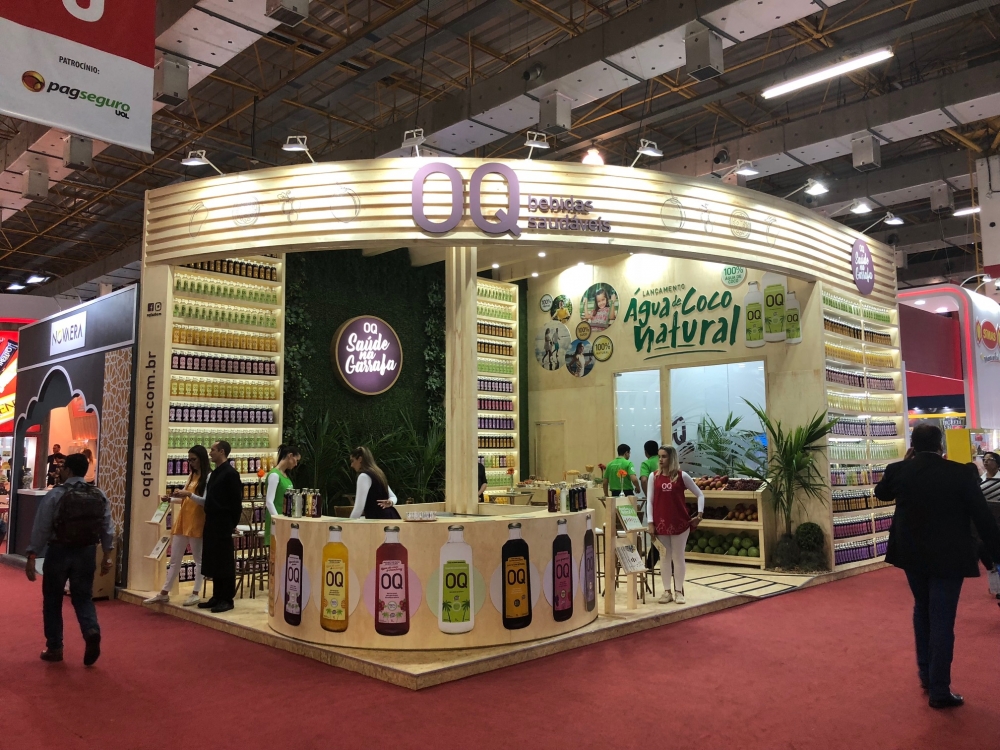Com muito verde, frutas e madeira, o estande passava o clima natural, que tem tudo a ver com as bebidas OQ, atraindo um grande público que experimentou e aprovou a nossa Água de Coco Natural.
